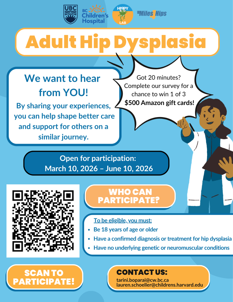 We are sharing on behalf of Miles4Hips and the Hippy Lab research team from the University of British Columbia. They are beginning data collection on a survey aimed at understanding the experiences of adults living with hip dysplasia. Hearing from a wide range of people will provide richer insights into daily life, quality of life, and the challenges faced by adults with hip dysplasia, which is essential for shaping research, improving care, and informing better treatments and resources.